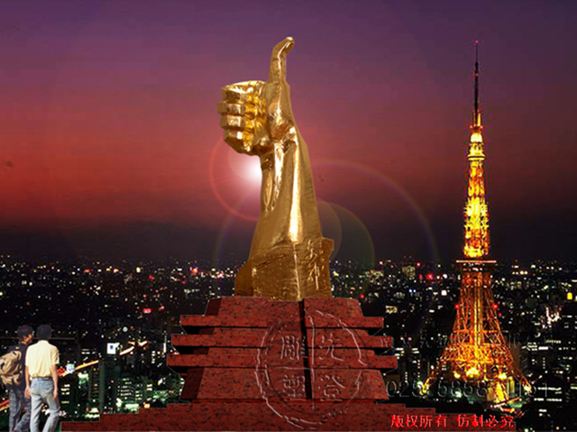 若要用一個(gè)詞來(lái)形容眼前的雕塑,莫過(guò)于“芝華士”了,沿用克里斯汀·拉科魯瓦對(duì)芝華士的評(píng)價(jià)“在我看來(lái),有些名字,哪怕只是聽(tīng)人提起或在書(shū)中偶遇,就會(huì)不自覺(jué)地將其與'聲名顯赫'聯(lián)系起來(lái),因?yàn)檫@些名字本身就代表著一種品質(zhì)、一種權(quán)威或者一種奢華氣質(zhì)。對(duì)我而言,'芝華士'這三個(gè)字就是'時(shí)尚'、'奢華'、'尊貴'的代名詞。”一種酒何以用“奢侈”、“最貴”、“時(shí)尚”來(lái)形容?路人皆知,喝芝華士是一種享受,將酒提升為藝術(shù),由內(nèi)而外的品鑒,是一種邊緣文化潮流化,這一切不僅源于調(diào)酒師Colin Scott以及精湛絕倫的技術(shù),而且他擁有世界頂級(jí)設(shè)計(jì)師克里斯汀·拉科魯瓦、亞歷山大•麥克奎恩。然而一尊雕塑,何以用一種酒來(lái)代稱?其實(shí)不然,芝華士的定義早已并非一樽酒而已,芝華士,享有世界蘇格蘭高級(jí)威士忌,他是外在與內(nèi)在的統(tǒng)一,誠(chéng)如雕塑所塑造的舉起的大拇指,同等的是一種邊緣文化,她需要人們鑒賞品位,需要足夠的情趣與審美素質(zhì)。如同芝華士所代表的“時(shí)尚”“豪華”“尊貴”,雕塑依然具有最豪華的陣容,華麗端莊的金箔,剛毅的輪廓,以及人類機(jī)理特征所表現(xiàn)的自然之美,他是藝術(shù)家獨(dú)具匠心的杰作,是一樽東方的皇室威士忌,享有與芝華士同樣的尊榮。用它來(lái)界定雕塑,而且是眼前獨(dú)具匠心的雕塑,是源于其洗凈鉛華般的唯美設(shè)計(jì)風(fēng)格以及其醇和出眾的口感,如雕塑從內(nèi)而外,周身所散發(fā)出的氣質(zhì)。