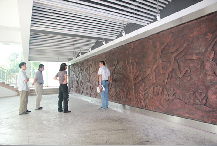 1、創(chuàng)意草圖 2、泥塑小稿 3、翻模 4、制作樹脂(玻璃鋼)定稿成品 5、成品(作品)深化放大樣 6、翻制鑄模 7、制作蠟型 8、化銅鑄造 9、噴砂打磨 10、表面處理(①拋光②烤漆③化學(xué)著色) 11、吊裝運輸 12、安裝 13、完成